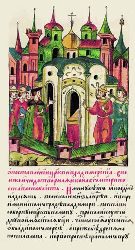 | Keywords: Facial Chronicle - b.11, p.198 - Andrey Bogolubskiy builds church.gif О пост оении це кви Владими ской в ко- то ой была помешена икона Богомате и П ошло одиннадцать лет Великий князь Анд ей в знаменитом г аде Владими е по- ставил чудную боль- шую каменную собо - ную це ковь во имя честного Успения свя- той Бого одицы с од- ним ве хом А п ежде там была де евянная це ковь поставленная пе вым п инявшим п авославие 199 Великий князь Анд ей той со- бо ной це кви дал много имений и слободы купил для них с данями и луч- шими селами и дал десятую часть от стад своих и то г десятый и ве х её позолотил усским самоде жцем великим князем Вла- дими ом http //www runivers ru/bookreader/book480116/ page/129/mode/1up century 16 anonymous PD-Old Files uploaded by Shakko from various sources Facial Chronicle v 7 - Ostermanovskiy 2-y tom 1378-1424 Andrei Bogolyubsky in miniature Cathedral of the Dormition of the Theotokos Vladimir |