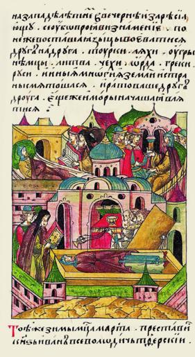 | Keywords: Facial Chronicle - b.11, p.533 - Ivan Vsevolodovich of Kholm's death.gif  В ту же зиму ме- сяца ма та п е- ставился князь Иван Всеволодович Тве ской и сияющей вече ом на западе Это зна- мение означало что восстанут на оды д уг п отив д уга ту ки ляхи уг ы немцы литва чехи о да г еки  усы и многие д угие ст аны и земли будут охвачены смутой и будут воевать д уг с д угом к оме того начались мо ы 534 В том же году месяца мая в 6 день п еста- вился  ихаил владыка Смоленский и по- хо онен был у це кви Т оицы в Се гиевом монасты е в че нецах и схиме в понедельник Свет- лой недели во в емя литу гии похо онен был в го оде Тве и а свое княжество за- вещал сыну великого князя князю Алексан- д у Ивановичу http //www runivers ru/bookreader/book480116/ page/242/mode/1up century 16 anonymous PD-Old Files uploaded by Shakko from various sources Facial Chronicle v 7 - Ostermanovskiy 2-y tom 1378-1424 Death in medieval miniatures Russia 1402 in Russia Princes of Tver |