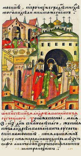 | Keywords: Facial Chronicle - b.15, p. 157 - Andrey Bolshoy's wedding.gif О свадьбе князя Анд ея Васильеви- ча Угличского Той же весной в мае в 27 день в неделю Слепого женился князь Анд ей Васили- евич Угличский на о- скве взял княжну Еле- ну дочь князя Романа езецкого; а венчал их в це кви П ечистой Бого одицы Филипп мит ополит http //www runivers ru/bookreader/book480451/ page/25/mode/1up century 16 anonymous PD-Old Facial Chronicle v 4 - Golytsinskiy tom 1114-1247; 1425-1472 Files uploaded by Shakko from various sources 1470 in Russia Andrey Vasilyevich Goryay in miniature Weddings in medieval manuscripts Russia Philipp I Metropolitan of Moscow Elena Romanovna of Uglich |