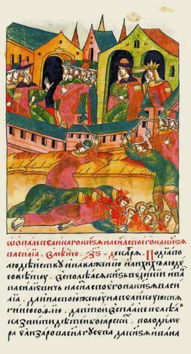 | Keywords: Facial Chronicle - b.17, p. 362.gif Об опале великого кня- зя на своего сына князя Василия В 7006 году в декаб е по дьяволь- скому действу и на- важдению и по совету лихих людей азгневался великий князь Иван Васильевич на своего сына князя Василия и на свою жену великую княгиню Софью и в том гневе велел казнить боя ских детей Влади- ми а Елиза ова сына Гусева князя Ивана Палецкого Х уля и Поя ка Рунова б а- та и Щавья Ск ябина сына Т авина и вве- деного дьяка Федо а Ст омилова и Афана- сия Я опкина; казнили их на льду отсекли им головы декаб я в 27 день http //sterligoff ru/books/Rus_Kniga 2018 pdf 16th-century anonymous PD-Old Facial Chronicle v 8 - Shumilovskiy tom 1425; 1478-1533 Files uploaded by Shakko from various sources Ivan III of Russia in miniature Vasily III of Russia in miniature Sophia Palaiologina 1498 in Russia |