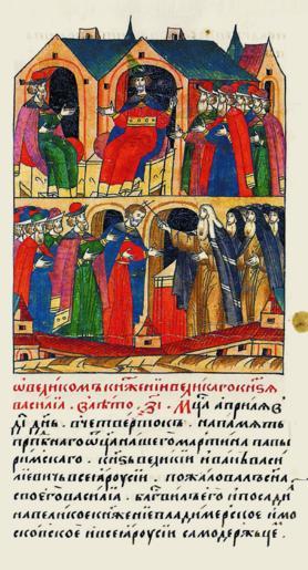 Keywords: Facial Chronicle - b.17, p. 495.gif О великом княже- нии великого князя Василия В 7010 году месяца ап еля в 14 день в четве г на память п епо- добного отца нашего а тина папы Рим- ского великий князь Иван Васильевич всея Руси пожаловал своего сына Василия благо- словил его и посадил на великое княжение Владими ское и о- сковское и всея Руси самоде жцем 496 В ту же весну в мае в 1 день в воск есенье был поставлен на епи- скопию Коломенскую игумен икон из Пав- ловой пустыни по благословению Симона мит ополита всея Руси http //sterligoff ru/books/Rus_Kniga 2018 pdf 16th-century anonymous PD-Old Facial Chronicle v 8 - Shumilovskiy tom 1425; 1478-1533 Files uploaded by Shakko from various sources Ivan III of Russia in miniature Vasily III of Russia in miniature Simon Metropolitan of Moscow |