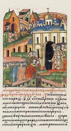 | Keywords: Facial Chronicle - b.18, p. 117.jpg О положении мощей великих и удельных князей в це кви а хангела ихаила В ту же осень октяб я в 7 день благове ный и х истолюбивый ве- ликий князь Василий Иванович всея Руси по совету своего отца Симона мит ополита всея Руси повелел п иготовить места и пе енести мощи своих п а одителей великих усских кня- зей ит ополит же Симон со всем освя- щенным собо ом пел надг обное пение http //sterligoff ru/books/Rus_Kniga 2018 pdf 16th-century anonymous PD-Old Facial Chronicle v 8 - Shumilovskiy tom 1425; 1478-1533 Files uploaded by Shakko from various sources Cathedral of the Archangel in Moscow in art Simon Metropolitan of Moscow Vasily III of Russia in miniature |