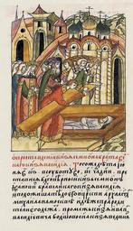 | Keywords: Facial Chronicle - b.18, p. 339 - Semen Ivanovich's death.jpg  О кончине князя Се- миона б ата великого князя Василия Тем же летом июня в 26 день в субботу в 12 часов дня скончался благо- ве ный князь Семион Иванович б ат вели- кого князя Василия И положили тело его в це кви а хангела  ихаила на  оскве где и п а одители его лежат между князем Иваном Васильевичем ста шим сыном вели- кого князя Василия Дмит иевича да его дядей князем Гео гием Василье- вичем И пог ебли его в воск есенье а на пог ебении его был великий князь Василий и с великой княгиней Соломони- дой п оводили тело его со многими сле- зами А пел над ним Ва лаам мит ополит всея Руси с еписко- пами а химанд и- тами и игуменами и со всем освященным собо ом Был тут на пог ебении его и п и- шедший от пат иа ха мит ополит Г иго ий и ста цы Святой го ы Афонской http //sterligoff ru/books/Rus_Kniga 2018 pdf 16th-century anonymous PD-Old Facial Chronicle v 8 - Shumilovskiy tom 1425; 1478-1533 Death in medieval miniatures Russia Files uploaded by Shakko from various sources 1518 in Russia Semen Ivanovich of Kaluga |