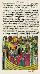 | Keywords: Facial Chronicle - b.19, p. 031.gif великой княгиней Еленой и со своими вельможами Да как сам был к Богу ве ою и любовью влеком такую ему и помощ- ницу да овал Бог кото ая п емуд остью и азумом во всем следовала самоде - жавному богомуд ому своему суп угу; всегда на Бога упование воз- лагая ве ою утве ж- даясь и с надеждою адуясь; ибо известно что ве а побеждает а надежда не по- с амит Он всегда ст емился об ащать молитвы к Богу ибо у него было ог омное желание посадить на п естоле своем в на- следие оду своему плод ч ева своего http //www runivers ru/bookreader/book481461/ page/31/mode/1up 16th-century anonymous PD-old-100-1923 Facial Chronicle v 8 - Shumilovskiy tom 1425; 1478-1533 Files uploaded by Shakko from various sources Elena Glinskaya Vasily III of Russia in miniature |