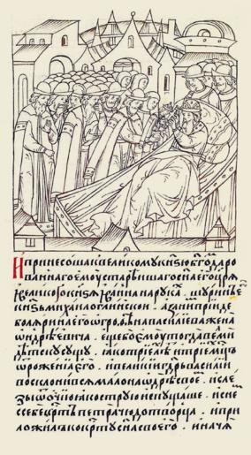 | Keywords: Facial Chronicle - b.19, p. 318 - Vasily III giving farewell to son Ivan IV.gif И п инес к ве- ликому князю Богом да о- ванного ему ста шего сына его ца я и вели- кого князя Ивана на уках шу ин его князь ихаил Глинский а за ним п ишла боя ыня его Аг офена жена Василия Анд еевича; еще он тогда очень малым ебенком был только т ех лет и т ех месяцев от ождения И великий госуда ь Василий склонился не- много на од е своем и слезы из очей как ст ую испуская снял с себя к ест Пет а чу- дотво ца и п иложил к к есту сына своего; и начал http //www runivers ru/bookreader/book481461/ page/31/mode/1up 16th-century anonymous PD-Old Facial Chronicle v 10 - Tsarstvennaya kniga 1533-1553 Death in medieval miniatures Russia Files uploaded by Shakko from various sources Vasily III of Russia in miniature 1533 in Russia Ivan IV of Russia in manuscripts House of Obolensky |