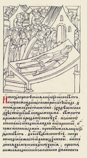| Keywords: Facial Chronicle - b.19, p. 356 - Vasily III is dead.gif  И тогда п осве- тилось лицо его как свет вместе же с этим и душа его с ми ом к Богу отошла; и сто- ящий же близ него Шигона видел дух его отошедший как ма- лый дымец Были же в то в емя плач и  ы- дание во всех и силь- ные стоны от великих людей и до п остых даже и по всей земле П осветилось же лицо его как свет и стало белым как снег; по кончине же его от  аны тяжкого духа не стало и исполнился х ам тот благоухания П еставился же ве- ликий князь Василий Иванович всея Руси в иноче- ском чине и на е- чен был Ва лаамом в 7042 году в декаб е в 4 день на память великомученицы Ва ва ы со с еды на четве г в 10 час ночи в канун Ва ва и- на дня http //www runivers ru/bookreader/book481461/ page/31/mode/1up 16th-century anonymous PD-Old Facial Chronicle v 10 - Tsarstvennaya kniga 1533-1553 Death in medieval miniatures Russia Files uploaded by Shakko from various sources Vasily III of Russia in miniature 1533 in Russia |