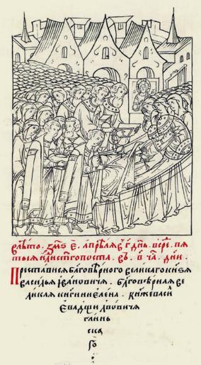 | Keywords: Facial Chronicle - b.19, p. 567 - Elena Glinskaya's death.gif Лицевой Летописный свод В 7046 году в ап еле в 3 день в с еду пятой недели святого Поста в 2 часа дня п е- ставилась благове - ного великого князя Василия Ивановича благове ная великая княгиня Елена дочь князя Василия Львови- ча Глинского http //www runivers ru/bookreader/book481461/ page/31/mode/1up 16th-century anonymous PD-Old Facial Chronicle v 10 - Tsarstvennaya kniga 1533-1553 Death in medieval miniatures Russia Files uploaded by Shakko from various sources 1538 in Russia Elena Glinskaya |