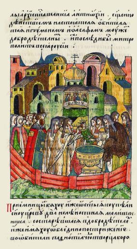 | Keywords: Facial Chronicle - b.19, p. 037 - Baptism of Ivan IV.gif а хиепископа Великой Антиохии священно- действием настоятеля обители той мужем доб одетельным игуменом Иоасафом кото ый позднее стал мит ополитом всея Руси П иемниками же от святой купе- ли сына ца ева были два неленостных молитвенника соста- ившихся в доб одете- лях; кото ые оба были пост ижены в обители чудотво ца Пафнутия Бо овского Один же из них имея да священства име- нем Даниил многие годы благоговейно п едстоял пе ед алта ем Господним и в Пе еславле воз- двиг с самого осно- вания великую оби- тель во имя святой Т оицы и П ечистой Бого одицы и всех святых Всех ст анни- ков и беспомощных успокаивал достойно ме твых пог ебал Во всем же был тих и к оток как гово- ится душа к отких благословенна от Бога; о нем же позднее ассказано в степени сей Вто ой по име- ни Касиан зовомый Босый и тот также был осеян духовной благодатью в подвигах выше естественных постничеством жесто- чайшим уд учал себя с юного воз аста был сопостником п е- подобному Иосифу Волоцкому поступки кото ого подобны делам бесплотного человека хотя и во плоти существующего Все дни своей жизни ходил обут в п остые лапти из лыка и одеж- да его также была п оста только одна власяница на свитке и мантия А когда великие мо озы воз- дух п оясняли он как будто в аю п ебывал ничем был не в едим http //www runivers ru/bookreader/book481461/ page/31/mode/1up 16th-century anonymous Facial Chronicle v 8 - Shumilovskiy tom 1425; 1478-1533 Files uploaded by Shakko from various sources Vasily III of Russia in miniature Ivan IV of Russia in miniature 1530 in Russia PD-Old |
