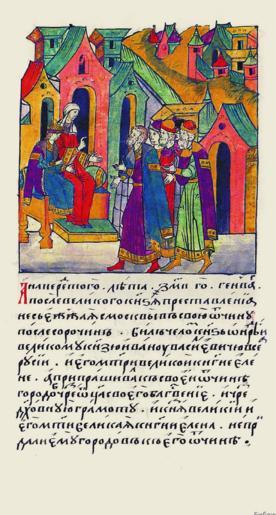 | Keywords: Facial Chronicle - b.20, p. 029.gif иниатю а Лицевого летописного свода XVI в А пе ед тем в 7042 году в янва е после кончины великого князя не выезжая из осквы в свою отчи- ну после со очин бил челом князь Анд ей великому князю Ивану Васильевичу всея Руси и его мате и великой княгине Елене а п и- п ашивал к своей отчине го одов све х тех что по отца его благословению и све х духовной г амоты И князь великий и его мать великая княгиня Елена не добавили ему го одов к его отчине» http //www runivers ru/bookreader/book482205/ page/43/mode/1up century 16 anonimus Facial Chronicle v 9 - Sinodalniy tom 1533-1542; 1553-1567 PD-Art Elena Glinskaya Andrey Ivanovich of Staritsa in miniature |