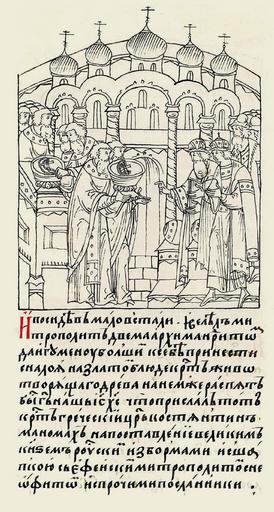 | Keywords: Facial Chronicle - b.20, p. 279 - Coronation Ivan IV.jpg  ru Лицевой летописный свод И посидев не- много встали и велел ми- т ополит двум а хи- манд итам и игумену п инести к себе с ана- лоя на золотом блюде к ест с частицей Животво ящего Д ева на кото ом был  аспят Господь наш Исус Х и- стос и кото ый п и- слал г еческий ца ь Константин  анамах на поставление вели- ким  уским князьям с ба мами и шапкой с Эфесским мит о- политом  еофитом и п очими посланни- ками century 16 http //www runivers ru/bookreader/book481478/ page/282/mode/1up RusPainter other versions PD-old-70-1923 Facial Chronicle v 10 - Tsarstvennaya kniga 1533-1553 Ivan IV's coronation Files uploaded by Shakko from various sources Uploaded with UploadWizard |