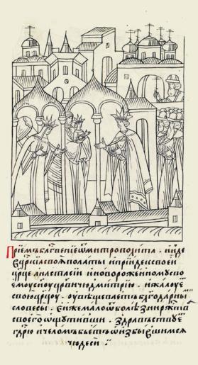 | Keywords: Facial Chronicle - b.21, p. 505.gif   иниатю а Лицевого летописного свода XVI в п иняв благослове- ние от мит ополита пошел в ца ские свои палаты И п ишел к своей ца ице Ана- стасии и к ново ож- денному своему сыну ца евичу Дмит ию; жалует свою ца ицу и увещевает благода - ными словесами Она же немного болезнуя после  ождения сына своего зд авствует госуда я и челом бьет о сбывшемся чуде http //www runivers ru/bookreader/book482205/ page/43/mode/1up century 16 anonimus Facial Chronicle v 10 - Tsarstvennaya kniga 1533-1553 PD-Art Anastasia Romanovna 1552 in Russia Dmitriy Ivanovich 1552-1553  |