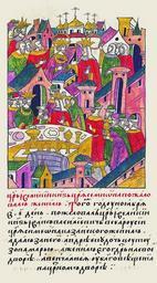 | Keywords: Facial Chronicle - b.22, p. 17 - Wedding of Simeon Bekbulatovich.jpg Ца ь и великий князь ца я Симеона пожаловал женил В том же году в нояб е в 3 день пожаловал ца ь и великий князь Иван Васильевич всея Руси ца я Казанского Симеона женил а дал за него дочь Анд ея Кутузова а ью; а женил его госуда ь на своем дво е а венчались в це кви Благовещения на ца ском дво е http //www runivers ru/bookreader/book482205/ page/17/mode/1up century 16 anonimus Facial Chronicle v 9 - Sinodalniy tom 1533-1542; 1553-1567 Files uploaded by Shakko from various sources Weddings in medieval manuscripts Russia House of Kutuzov 1552 in Russia Simeon Bekbulatovich PD-Art |