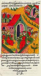 Keywords: Facial Chronicle - b.22, p. 256.gif Лицевой летописный свод И ца ь и великий князь их отпустил а своих послов к ко олю назначил боя ина Ивана ихайловича Во онцова да казначея Федо а Ивановича Сукина да дьяка Бо иса Щекина; а из осквы пошли послы литовские в фев але в 10 день http //www runivers ru/bookreader/book482205/ page/17/mode/1up century 16 anonimus Facial Chronicle v 9 - Sinodalniy tom 1533-1542; 1553-1567 Files uploaded by Shakko from various sources PD-Art House of Vorontsov 1556 in Russia |