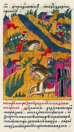 | Keywords: Facial Chronicle - b.22, p. 301.gif  Пет  о озов ходил из Казани на А ское В месяце мае ходил Пет же  о озов из Казани на А ское и за А ским на  еше  еке вст етил Пет а Девляк му за Калай му зы б ат с а скими людьми И Пет на него послал голов детей боя ских князя Пет а Глебова Засекина да Романа Пивова да Еналеев двух а с ним дети боя ские и ст ельцы и новок ещеные; Девляка со всеми това ищи побили и самого живым взяли и многих его това ищей пе еловили И после того Пет воевал 10 дней и все А ские места повоевал и побил многих людей и полоном вывел бесчисленно много Да с Пет ом вместе ходил без мест воевода Феодо Иванович Буту лин и в Казань п ишли дал Бог зд аво http //www runivers ru/bookreader/book482205/ page/17/mode/1up century 16 anonimus Facial Chronicle v 9 - Sinodalniy tom 1533-1542; 1553-1567 Files uploaded by Shakko from various sources PD-Art House of Morozov |