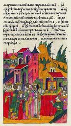 Keywords: Facial Chronicle - b.22, p. 334.gif Лицевой летописный свод Об отп авке иконы чудотво ца иколы Велико ецкого В том же месяце в 3 день была отп авлена в Вятку обновленная икона иколы Велико ецкого а обновлял ее сам ака ий мит ополит всея Руси и Анд ей п отопоп Благовещенский так как иконному масте ству были научены мит ополит и Анд ей И ук асили ее золотом и жемчугом и д агоценными камнями а п овожал икону ца ь и великий князь со своей ца ицей и со своим сыном ца евичем Иваном и князь Ю ий Васильевич со своей княгиней и боя е и вельможи и множество на ода http //www runivers ru/bookreader/book482205/ page/17/mode/1up century 16 anonimus Facial Chronicle v 9 - Sinodalniy tom 1533-1542; 1553-1567 Files uploaded by Shakko from various sources PD-Art Macarius of Moscow Athanasius Metropolitan of Moscow Ivan Ivanovich Anastasia Romanovna Yuri of Uglich 1532-1563 in miniature Iuliania Paletskaya