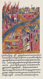 | Keywords: Facial Chronicle - b.23, p. 244.jpg  Лицевой летописный свод В том же месяце в 17 день в с еду на память святой великомученицы  а ины в седьмом часу дня заго елся на А бате у це кви Риз Положения дво князя Федо а Пожа ского И пого ело многое множество х амов и дво ов от Успенского ов ага подле отк ытого места до д овяного дво а и бе ег весь до це кви святого Клементия в Че то ье и по Семчинское сельцо и до це кви П ечистой на  огилицах и А бат весь и за А бат по  овинский монасты ь А ца ица и великая княгиня Анастасия в то в емя была больна и ца ь и великий князь великую княгиню п оводил в свое село в Коломенское с большим т удом потому что болезнь ее была очень тяжела http //www runivers ru/bookreader/book482205/ page/17/mode/1up century 16 anonimus Facial Chronicle v 9 - Sinodalniy tom 1533-1542; 1553-1567 Files uploaded by Shakko from various sources PD-Art Fires in Moscow Anastasia Romanovna |
