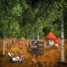 Keywords: fairy tales fairytale forest birch forest fantasy digital art girl cat mushrooms man mushroom house