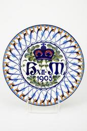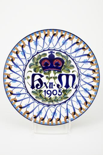 Keywords: Fajans, tallrik, baksida, 1905-1906 - Hallwylska museet - 90472.tif TALLRIK Rund med kälformig kep och snett utstående brett brätte samt på fotkant Dekor I färger under blyglasyr denna finsprucken Godset vitt På bottnens insida konung Haakon VII s och drottning Mauds av Norge krönta initialer i mörkblått kronans foder i mörkrött nedtill årtalet i samma färg som initialerna; nedanför årtalet samt kring initialerna rankor i mörkare och ljusare grönt med blad liknande lingonrisets nerverna röda; runt bottenkanten en mörkblå rand På brättet dekor av tre löst tvinnade band i mörkblått upphängda vid ytterkanten i bruna öglor på varannan av bandet vindlingar två par bladliknande ornament i ljusblått Runt ytterkanten en rand i mörkblått därinnanför en något bredare dylik i ljusblått avbruten av nyssnämnda öglor På bottnens utsida en påklistrad lapp i grönt med upphöjt guldtryck med texten KRISTIANIA KUNSTHANDEL H 3 3 cm; D 24 8 cm Köbenhavns fajancefabrik f d Aluminia Från slutet av 1905 eller från 1906 Gåva till Wilhelmina von Hallwyl från hennes dotterson Rolf de Maré julaftonen 1914 Inköpt av honom hos konsthandlaren Ludv F Olsen Co Kristiania original caption Fajans tallrik baksida 1905-1906<br/> Nyckelord Fat Tallrik Signatur Fajans Föremålsbild - 1905 1906 size cm 3 3 24 8 HWY place of origin Köpenhamn DK original filename hm_dig7214 13462 inventory number HWY XLVI I A b 01 90472 CC-BY-SA Erik Lernestål <gallery caption Different images of same object > File Fajans tallrik baksida 1905-1906 - Hallwylska museet - 90471 tif </gallery> Erik Lernestål Plates Plates Signatures Faience Faience in the Hallwyl museum Media contributed by LSH 2013-10 |