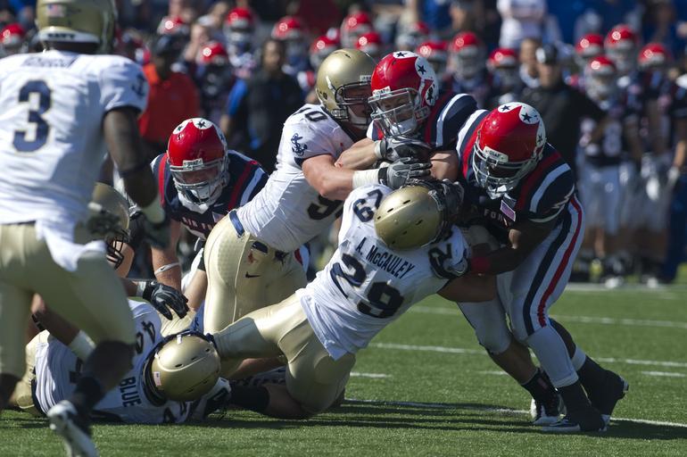 | Keywords: Falcons on offense at Navy at Air Force 2010-10-02 3.JPG U S Air Force Academy Falcon Running Back Jared Tew is tackled by Linebacker Aaron McCauley and Defensive End Billy Yarborough in Colorado Springs Colo Oct 2 2010 The Falcons ended a seven year drought defeating the Midshipmen 14-6 http //www defense gov/PhotoEssays/PhotoEssaySS aspx ID 1890 2010-10-02 P01 Chad J McNeeley PD-USGov-Military-Navy Files by User BrokenSphere 2010 Air Force Falcons football team 2010 Navy Midshipmen football team |