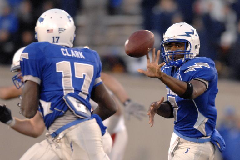 | Keywords: Falcons on offense at New Mexico at Air Force 2008-10-23 1.jpg U S Air Force Academy freshman quarterback Tim Jefferson options to freshman tailback Asher Clark The Falcons' option rushing attack ground out 227 yards in a 23-10 win over University of New Mexico Oct 23 at Falcon Stadium in Colorado http //www af mil/news/story asp id 123121056 2008-10-23 Dennis Rogers PD-USGov-Military-Navy Files by User BrokenSphere 2008 Air Force Falcons football team 2008 in Colorado | ||||