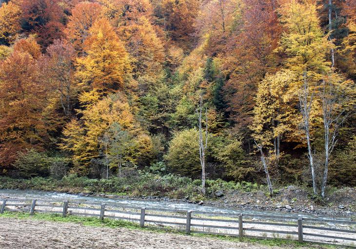 Keywords: fall river season nature travel scenic landscape tourism fall trees forest autumn outdoor mountains yellow tree romania mocanita stone wood fence fence leaves brown