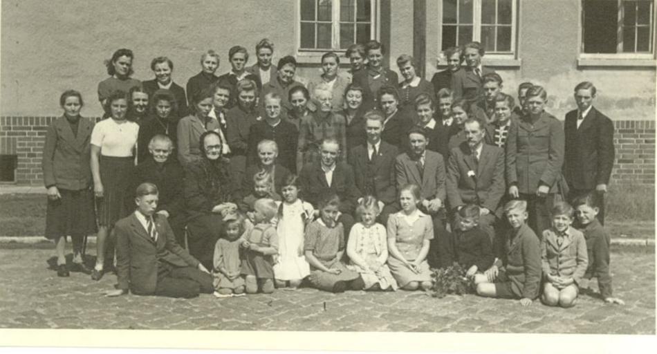 | Keywords: arthur voth refugees germany arthurvothrefugeesgermany fallingbostel camp fallingbostelcamp world war ii worldwarii mennonite central committee mennonitecentralcommittee birthdays monochrome blackandwhite outdoor black and white Caption: May 30, 1948. Birthday Children - those whose birthday was in May. Program was on May 20. Youngest, 1 year old, oldest - 75 years old, total 92, Fallingbostel Camp.  Citation: Arthur Voth Photographs, 1947-1949. HM4-387 Box 1 Folder 2 photo 22. Mennonite Church USA Archives - Goshen. Goshen, Indiana. Caption: May 30, 1948. Birthday Children - those whose birthday was in May. Program was on May 20. Youngest, 1 year old, oldest - 75 years old, total 92, Fallingbostel Camp.  Citation: Arthur Voth Photographs, 1947-1949. HM4-387 Box 1 Folder 2 photo 22. Mennonite Church USA Archives - Goshen. Goshen, Indiana. |
