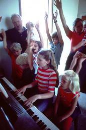 Keywords: Family gathered around piano.jpg A Caucasian family group of a father mother and eight children around a piano One of the younger women is playing the piano and the others are following the music and singing They raise their hands while singing It appears to be a family room home setting These people are a Mormon family They are presently being studied for their low cancer death rate Topics/Categories People -- Child People -- Family/Friends People -- Recreation Type Color Photo Source National Cancer Institute Linda Bartlett Photographer 2057 1980 Reuse Restrictions None - This image is in the public domain and can be freely reused Please credit the source and/or author listed above Linda Bartlett Photographer PD-USGov-HHS-NIH Media from National Cancer Institute Visuals Online Images uploaded by Fæ Unidentified Latter-day Saints Children with pianos Blond children
