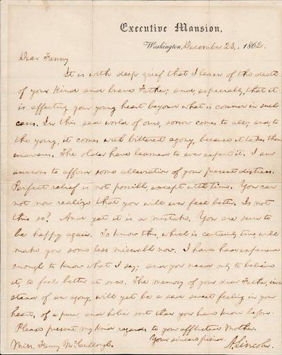 | Keywords: Fanny McCullough Letter.jpg en Letter of condolence from Abraham Lincoln to Fanny McCullough 23 December 1862 http //www shapell org/manuscript/lincoln-mccullough-civil-war-condolence Shapell Manuscript Foundation Abraham Lincoln other versions PD-old-70-1923 Abraham Lincoln Manuscripts of the American Civil War |