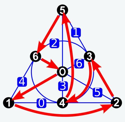 | Keywords: Fanosingercycle.svg en Fano plane The numbers for the points black and the lines blue are chosen thus that the plane appears to be the plane generated by a perfect difference set see the article http //www ams org/journals/tran/1938-043-03/S0002-9947-1938-1501951-4/S0002-9947-1938-1501951-4 pdf A THEOREM IN FINITE PROTECTIVE GEOMETRY AND SOME APPLICATIONS TO NUMBER THEORY by JAMES SINGER The arrows red show a generator of a so called Singer cycle a cyclic permutation of all points of the plane de Die Fano-Ebene erweist sich bei geeigneter Nummerierung der Punkte schwarz und Geraden blau als eine Ebene die von einer Differenzmenge abstammt Siehe dazu den Artikel von James Singer PDF in der englischsprachigen Beschreibung Die Pfeile rot stehen für eine erzeugende Kollineation eines Singer-Zyklus d i eine Kollineation die die gesamte Punktmenge der Ebene zyklisch vertauscht own KlioKlein 2012-04-03 File Fanoperm713 svg free on commons is the original which I have modified and extended Fano plane collineations Graphs with labelled edges and vertices Cc-zero |