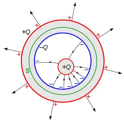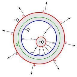 | Keywords: Faradays ice pail experiment.svg Diagram of electric fields in Faraday's ice pail experiment A charged object small sphere is placed inside a conductive metal shell large sphere The electrostatic field of the interior charge causes the mobile charges in the metal to separate inducing a positive charge on the inner surface of the shell and a negative charge on the outer surface It is found experimentally that the induced charge on the shell is exactly the same magnitude as the charge on the object This can be proved by applying Gauss' Law to the Gaussian surface S contained inside the metal of the shell Since S is inside the volume of metal it is in a region of zero electric field So the electric field flux through S is zero Therefore the net charge inside S must be zero <math>\iint\limits_S \mathbf E \cdot d\mathbf A \frac 1 \epsilon_0 Q + Q_ induced 0 \ </math> Since the only charges inside S are the charge Q on the object and the induced charge Q<sub>induced</sub> on the inside surface of the shell these two charges must be equal and opposite own 2010-12-26 Chetvorno I Chris Burks Chetvorno the author of this work release it into the public domain for any use whatever Field diagrams Gauss' Law |