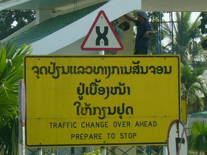 Keywords: Fari-Wechsel.jpg Vientiane Laos Change of Traffic direction in road transport symbol and text sign at the Thai-Lao border ” Thai “Lao Friendship Bridge ” Vientiane with right hand traffic †’ Nong Khai with left hand traffic This sign is posted on the Laotian side just in front of the bridge The border is further ahead but the border control is done here A few meters ahead there is a traffic light regulating the crossing of sides junction The picture shows a very rare traffic sign X Verkehrszeichen zur bevorstehenden Ă„nderung des Fahrtrichtungswechsels im StraĂźenverkehr Laos mit Rechtsverkehr †’ Thailand mit Linksverkehr an der Thai-Lao-FreundschaftsbrĂĽcke zwischen Vientiane/Laos und Nong Khai/Thailand d h noch vor der BrĂĽcke in Richtung Thailand own 2004-11-20 User Mattes Bilingual road signs Black on yellow signs Change of driving directions Laos Red and white signs Road signs in Laos Signs in Laos Thai-Lao Friendship Bridge Taken with Panasonic Lumix DMC-LC50 Work by Mattes 2004 User Mattes/Contributions/Topics/banners coat of arms flags logos seals and signs User Mattes/Contributions/Topics/Transport User Mattes/Contributions/Topics/Laos |