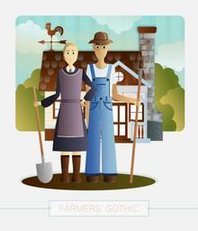 Keywords: farmers gothic farmers tribute grant wood grant wood tribute cartoon facial expression spade hay fork pitchfork country country house gothic face apron overall poster house countryside farmhouse farm rural building village