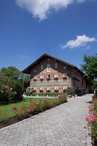 Keywords: farmhouse estate bavaria upper bavaria old rustic wood balcony input patch flower box window flowers wooden boards old farmhouse facade historically brick atmosphere geranium window sill house flower jewelry gable