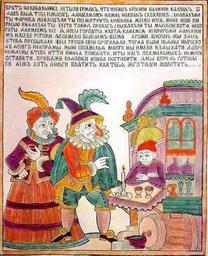 | Keywords: Farnos the Red Nose and his wife Pegasya.JPG en Farnos the Red Nose and his wife Pegasya Russian humorous lubok ru Сценка в кото ой Фа нос и его жена Пигасья вст ечаются с целовальником Е маком Б ат целовальник не ты ли Е мак что носишь к асный валеный колпак Отдал бы я тебе поклон с хохлом Знавал ли ты Фа носа желаешь ли ты посмот еть к асного моего носа Жену мою Пигасью видал ли ты Вести такие п о нас слыхал ли ы собою хотя не богаты да имеем у себя носы го баты и хотя кажемся неп игожи да не носим на себе огожи а во хмелю бываем весьма угожи Вче ась мы здесь у тебя п ебывали и все г оши свои п огуляли тогда были пьяны и к асходу денег неуп ямы ыне с похмелья много мы имели воздыхати да п инуждены к тебе идти винца поискати и ты нас похмельных не моги оставити п икажи ендовку и пива поставити а мы вп едь готовы будем хоть деньгами платить или тебя жгутами молотить http //www argentium-book ru/forum/1923/1515_ЗАГАДОЧ ЫЙ_РУССКИЙ_ЛУБОК Anonymous folk artist century 18 PD-old-100 Lubok Jesters in engravings |