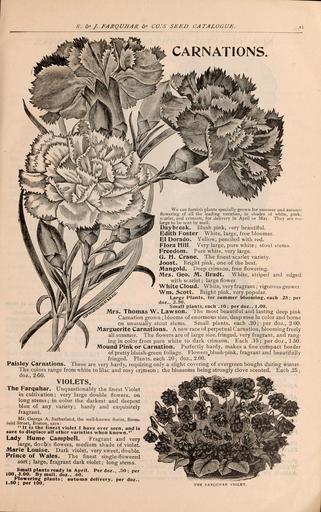 | Keywords: Farquhar's catalogue of seeds 1901 (16583182105).jpg  A' J FARQUHAR c CO 'S SEED CATALOGUE <br> CARNATIONS <br> We can furnish plants specially grown for summer and autumn <br> flowering of all the leading varieties in shades of white pink <br> scarlet and crimson for delivery in April or May They are toe <br> large to be sent by mail <br> Daybreak Blush pink very beautiful <br> Edith Foster White large free bloomer <br> EI Dorado Yellow penciled with red <br> Flora HilL Very large pure white; stout stems <br> Freedom Pure white very large <br> Q H Crane The finest-scarlet variety <br> Joost Bright pink one of the best <br> Mangold Deep crimson free flowering <br> Mrs Geo M Bradt White striped and edged <br> with scarlet ; large flower <br> White Cloud White very fragrant ; vigorous grower <br> Wm Scott Bright pink very popular <br> Large Plants for summer blooming each 25; per <br> doz 2 50 <br> Small plants each 10; per doz 1 00 <br> Mrs Thomas W Lawson 'lhe most beautiful and lasting deep pink <br> Carnation grown ; blooms of enormous size deep rose In color and borne <br> on unusually stout stems Small plants each 20; per doz 2 00 <br> Marguerite Carnations A new race of perpetual Carnation blooming freely <br> all summer The flowers are of large size fringed very fragrant and rang- <br> ing in color from pure white to dark crimson Each 15; per doz 1 50 <br> Mound Pink or Carnation Perfectly hardy makes a fine compact border <br> of pretty bluish-green foliage Flowers blush-pink fragrant and beautifully <br> fringed Plants each 20; doz 2 00 <br> Paisley Carnations These are very hardy requiring only a slight covering of evergreen boughs during winter <br> The colors range from white to lilac and rosy crimson ; the blossoms being strongly clove scented Each 25 ; <br> doz 2 -50 <br> VIOLETS <br> The Farquhar Unquestionably the finest Violet <br> in cultivation ; very large double flowers on <br> long stems ; in color the darkest and deepest <br> blue of any variety; hardy and exquisitely <br> fragrant <br> Mr George A Sutherland the well-known florist Brom- <br> rield Street Boston says <br> ˘ –  It is the finest violet I have ever seen and is <br> sure to displace all other varieties when known <br> Lady Hume Campbell Fragrant and very <br> large double flowers medium shade of violet <br> Marie Louise Dark violet very sweet double <br> Prince of Wales The finest single-flowered <br> sort ; large fragrant dark violet ; long stems <br> Small plants ready in April Per doz <br> 10O 3 00 By mail doz 60 <br> Flowering plants; autumn delivery <br> 1 50; per 100 <br> per <br> 50 ; per <br> doz <br> THE FARQL'HAR VIOLET 42283986 133538 66475 Text http //www biodiversitylibrary org/page/42283986 1901 10 5962/bhl title 66475 Henry G Gilbert Nursery and Seed Trade Catalog Collection ; R J Farquhar Company Biodiversity Heritage Library Farquhar's catalogue of seeds 1901 plants bulbs fertilizers tools sundries / Garden Stories Bedding plants Boston Catalogs Flowers Fruit Gardening Massachusetts Nurseries Horticulture Nursery stock Perennials R J Farquhar Company Seeds Shrubs U S Department of Agriculture National Agricultural Library bhl page 42283986 dc identifier http //biodiversitylibrary org/page/42283986 bhlGardenStories Carnation BHLinbloom nurseries horticulture r j farquhar company u s department of agriculture national agricultural library bhlgardenstories bhlinbloom Information field Flickr posted date ISOdate 2015-02-19 CC-BY-2 0 BioDivLibrary https //flickr com/photos/61021753 N02/16583182105 2015-08-24 02 53 04 cc-by-2 0 PD-old-70-1923 Bedding plants Shrubs Farquhar's catalogue of seeds 1901 Photos uploaded from Flickr by Fæ using a script |