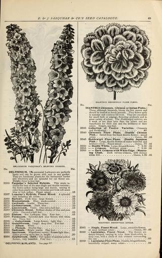 | Keywords: Farquhar's catalogue of seeds 1901 (16582516822).jpg R 5r»y FARQUHAR CO 'S SEED CATALOGUE <br> 45 <br> DELPHINIUM FARQUHAR'S SELECTED HYBRIDS <br> N T o Pkt <br> DELPHINIUM TRe perennial Larkspurs are perfectly <br> hardy and caa be grown with ease in any garden <br> They are handsome plants for the herbaceous border <br> and shrubbery and are splendid for cut flower use <br> Height; three to four feet <br> 3255 Farqunar's Selected Hybrids This strain in- <br> cludes the best of the new single and double varieties ; <br> the flower-spikes being large and stately varying in <br> color from pearly white to lavender and from soft azure <br> blue to rich indigo Finest mixed 15 <br> 3257 Lemoine's Hybrids Finest Mixed A splendid <br> race including all colors 10 <br> 3260 Barlowi Dark blue; large flowers 05 <br> 3265 Brunonianum Blue; musk-scented 15 <br> 3270 Cardinale Scarlet Three feet 15 <br> 3275 Cashmerianum Dark blue 10 <br> 3277 Caucasicum Violet One-and-a-half feet 15 <br> 3280 Chinensis Mixed Brilliant shades of blue and pure <br> white One-and-a-half feet 05 <br> 3285 Elatum Bee Larkspur; blue Four feet 05 <br> 3290 Formo su m Splendid dark blue flowers with white <br> eye Three feet ¢ « 05 <br> 3295 ” Coelestinum Large flowers light blue 05 <br> 3300 Grandiflorum Large deep blue Two feet 05 <br> 3305 ” Album White 05 <br> 3310 ” Plenum Double blue 05 <br> 3320 Nudicaule Bright scarlet One foot 10 <br> 3325 Speciosum Magnificent variety ; flowers light blue ; <br> spikes growing seven feet in height 20 <br> 3330 Sulphureum Zalil Tall spikes of sulphur-yellow <br> flowers very beautiful Four feet 15 <br> DELPHINIUM PLANTS See page 87 <br> DIANTHUS HEDDEWIGI1 FLORE PLENO <br> No Pkt <br> DIANTHUS Chinensis Chinese or Indian Pinks <br> These although biennials bloom the first season and <br> should be treated as hardy annuals They flower early <br> in summer and continue till frost They are excellent <br> for small beds or edgings flowering profusely and in <br> great variety of colors The Heddewigii varieties are <br> a week or ten days later than the others and are <br> remarkable for their size and the brilliancy of their <br> colors Height one foot <br> 3335 Collection of Twelve Varieties Chinensis <br> and Heddewigii ¢ 40 <br> 3340 Chinensis Flore Pleno Double Chinese <br> Pink Saved from the finest double flowers ; mixed <br> colors ¢ Ounce 30 05 <br> 3345 Heddewigii Flore Pleno Double Japanese <br> Pink Large double flowers of many beautiful and <br> brilliant colors Finest mixed Ounce 75 05 <br> 3350 ” Double White Large fringed flowers 1 00 05 <br> 3355 Crimson Brilliant shade 1 00 05 <br> 3360 Dark Crimson with White Edge Mourn- <br> ing Cloak Dark velvety crimson with distinct <br> white frill Ounce 1 00 05 <br> DIANTHUS HEDDEWIGII SINGLE <br> 3385 ” Single Finest Mixed Large attractive flowere <br> of most brilliant colors Ounce 60 05 <br> 3390 ” Laciniatus Finest ilixed The flowers are <br> deeply fringed varying in color from blush-white_ to <br> deep rose with a circle of rich crimson surrounding <br> the eye ¢ 05 <br> 3392 ” Laciniatus Flore Pleno Double fringed flowers <br> beautifully striped; many colors 05 42284044 133538 66475 Text http //www biodiversitylibrary org/page/42284044 1901 10 5962/bhl title 66475 Henry G Gilbert Nursery and Seed Trade Catalog Collection ; R J Farquhar Company NameFound Brunonianum NameFound Cashmerianum NameFound Caucasicum NameFound Coelestinum NameFound Dianthus NameConfirmed Dianthus EOLID 11254753 NameBankID 2646562 NameFound Dianthus heddewigii NameConfirmed Dianthus heddewigii NameBankID 5874164 NameFound Elatum NameFound Grandiflorum NameFound Laciniatus NameFound Speciosum NameFound Sulphureum Biodiversity Heritage Library Farquhar's catalogue of seeds 1901 plants bulbs fertilizers tools sundries / Garden Stories Bedding plants Boston Catalogs Climbing plants Flowers Gardening Massachusetts Nurseries Horticulture Nursery stock Perennials R J Farquhar Company Seeds U S Department of Agriculture National Agricultural Library bhl page 42284044 dc identifier http //biodiversitylibrary org/page/42284044 bhlGardenStories Delphiiums Dianthus BHLinbloom nurseries horticulture r j farquhar company u s department of agriculture national agricultural library bhlgardenstories bhlinbloom Information field Flickr posted date ISOdate 2015-02-19 CC-BY-2 0 BioDivLibrary https //flickr com/photos/61021753 N02/16582516822 2015-08-24 02 53 02 cc-by-2 0 PD-old-70-1923 Bedding plants Climbing plants Farquhar's catalogue of seeds 1901 Photos uploaded from Flickr by Fæ using a script |