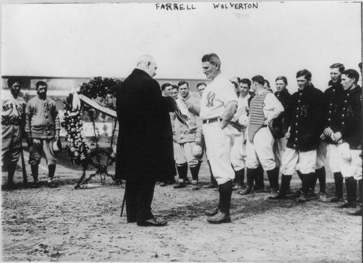 | Keywords: Farrell Wolverton Highlanders.jpg New York Highlanders team president Frank Farrell presenting a loving cup to Highlanders manager Harry Wolverton while the Highlanders now known as the Yankees and Boston Red Sox look on cph 3b24500 1912-04-12 Bain News Service PD-Bain 1912 in Major League Baseball Major League Baseball managers Baseball players from Ohio Sports in New York City People receiving trophies or awards | ||||