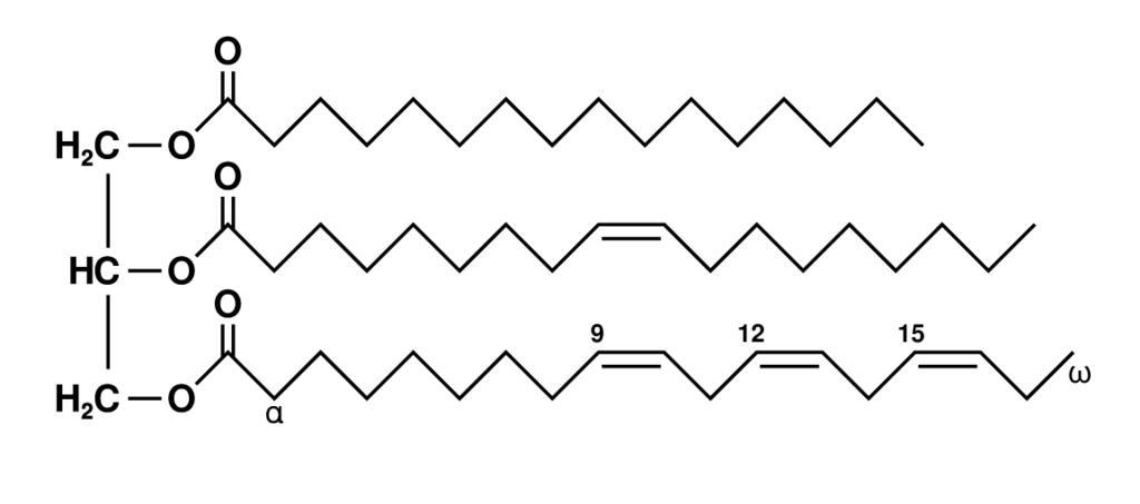 Keywords: Fat triglyceride shorthand formula.PNG Shorthand line formula for a typical example molecule of <br> Fat Triglycerides<br> in native fat or oil <br> left part glycerol <br> right part from top to bottom palmitic acid oleic acid alpha-linolenic acid <br> chemical formula C<sub>55</sub>H<sub>98</sub>O<sub>6</sub> <br> ---- Strichformel für ein typisches Beispielmolekuel eines<br> Fett-Triglycerides<br> in pflanzlichen Fetten und Oelen <br> linker Teil Glycerin<br> rechts von oben nach unten Palmitinsaeure Oelsaeure alpha-Linolensaeure <br> Summenformel C<sub>55</sub>H<sub>98</sub>O<sub>6</sub> <br> ---- shorthand formula of a fat triglyceride molecule author 2005-04-21 Wolfgang Schaefer released to public domain on 21 April 2005 by Wolfgang Schaefer Seoul Korea Triglycerides Palmitate esters |