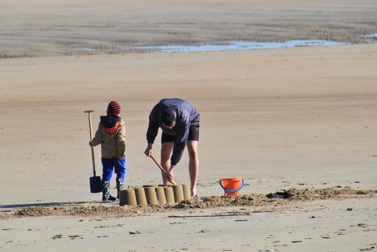 Keywords: father son man child boy beach sand beach sandburg build play blade sand shovel sea leisure holiday relaxation children human sand nature north sea person ebb coast