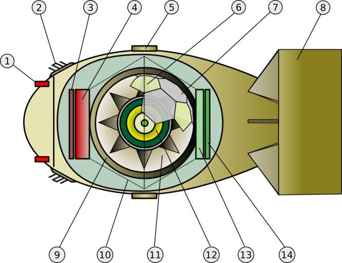 | Keywords: Fatman inner1.png Fatman inner1 svg Interior of the Fatman bomb Thanks to en User Fastfission for the precious information about the design and plans of the bomb Done with Inkscape 0 41 This is really not supposed to be accurate the interior is still classified but it gives a rough idea of the main parts of the implosion bombs Gadget and Fat Man AN 219 destruct fuse Archie radar antenna Plate with batteries to detonate charge surrounding nuclear components X-Unit a firing set placed near the charge Hinge fixing the two ellipsoidal parts of the bomb High explosive pentagonal lens 12 units around the core made of high and low velocity explosive High explosive hexagonal lens 20 units around the core made of high and low velocity explosive California Parachute tail aluminium Dural casing ~140 cm inner diameter Cones that contained the whole sphere Explosive lenses low and high velocity Nuclear material see other figure for details about the different layers Plate with instruments radars baroswitches and timers Barotube collector derivative works Fatman inner1 svg Cross sections of nuclear weapons Fat Man Diagrams labelled with numbers only |