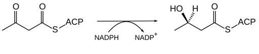 Keywords: FattyAcid-MB-Reduction1.svg acyl carrier protein is reduced by NADPH into <small>D</small>-3-hydroxybutyryl ACP <br>See 3-oxoacyl- acyl-carrier-protein reductase File FattyAcid-MB-Reduction1 png 2016-02-02 Anypodetos Other fields B v + Oxidoreductases Fatty acid synthesis Cc-zero |