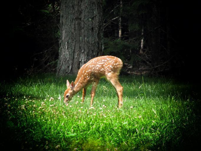 Keywords: fawn deer forest trees wildlife vignette grazing grass summer spring nature outside countryside