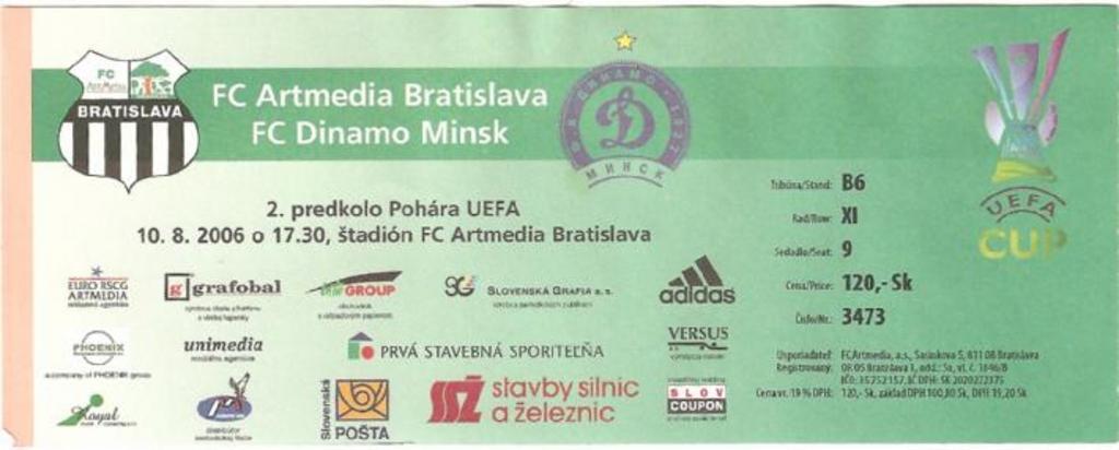 | Keywords: FC Artmedia Bratislava - FC Dinamo Minsk.JPG sk Vstupenka na zápas 2 predkola Pohára UEFA 2006/2007 medzi FC Artmedia Bratislava dnes FC Artmedia Petržalka a FC Dinamo Minsk Výsledok 2-1 cs Vstupenka na zápas 2 predkola Pohár UEFA 2006/2007 mezi FC Artmedia Bratislava dnes FC Artmedia Petržalka a FC Dinamo Minsk Výsledek 2-1 en The ticket for the 2nd game predkola UEFA Cup 2006-07 between FC Artmedia Bratislava now FC Artmedia Petržalka and FC Dinamo Minsk Result 2-1 own Marián 2 2008-11-28 FC Artmedia Petržalka UEFA Cup 2006-07 FC Dinamo Minsk Association football tickets |