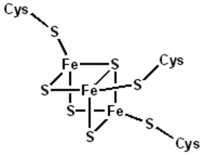 Keywords: Fe3S4.png Structural drawing of Fe3S4 cluster 2006-03-06 own assumed Scienthomas Check categories 2008 November 14 en wikipedia Ferredoxin pt wikipedia Ferredoxina Iron-sulfur compounds