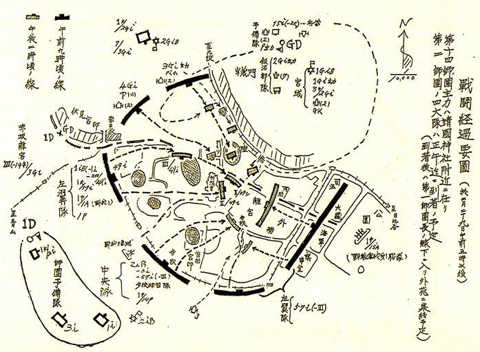 | Keywords: February 29 map 1936.jpg ja 2 29日の戦闘経過要図 永田町 帯を占拠する叛乱軍を包囲した上で ラジオとビラによる降伏勧告によって下士官兵を帰順させた 増援に た歩兵第49聯隊(甲 )や歩兵第59聯隊(宇都宮)の 部も攻囲に加わっている 段方 からは近衛歩兵第3・第4聯隊が <br/><br/> The battle map as of AM9 00-14 00 February 29 1936 With the reinforcement of the IJA 15th 49th 59th Infantry Regiments the attack was about to begin at AM9 00 The rebel force lost the command of its soldiers and surrendered by the evening of Februay 29; hence the end of the coup attempt 昭和十 年二 二十六日~同年三 日二・二六事件警備経過ノ概要 (昭和十 年三 日戒厳司令部参 部第二課 成)[香椎研 編 秘録二・二六事件 永田書房刊 収 p88] 戒厳司令部参 部第二課 <br/>Martial Law HQ of 1936 1936-03-01 PD-Japan-organization PD-Japan-organization Maps of the February 26 Incident |