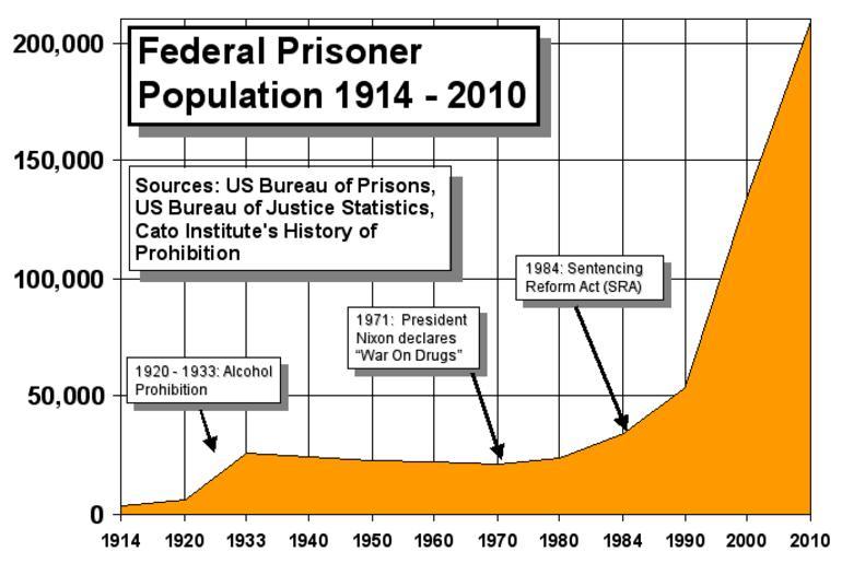 | Keywords: Federal timeline US prisoners.gif U S Federal Bureau of Prisons - http //www bop gov bop gov - http //www bop gov/locations/weekly_report jsp Weekly Population Report U S Bureau of Justice Statistics BJS See http //bjs ojp usdoj gov/index cfm ty tp tid 1 Corrections The Punishing Decade Prison and Jail Estimates at the Millennium May 2000 Justice Policy Institute http //www nationalinstituteofcorrections gov/Library/015837 http //www justicepolicy org/images/upload/00-05_REP_PunishingDecade_AC pdf PDF file Includes several timelines Uses BJS and other data See Graph 1 for Number of Prison and Jail Inmates 1910-2000 It does not separate federal state and jail inmates Sources listed in the endnotes do See Historical Corrections Statistics in the United States 1850-1984 NCJ 102529 Published in 1986 http //www ncjrs gov/App/publications/Abstract aspx id 102529 http //www ncjrs gov/pdffiles1/pr/102529 pdf PDF file Prison Inmates at Midyear 2009 NCJ 230113 http //bjs ojp usdoj gov/index cfm ty pbdetail iid 2200 By Heather C West Ph D BJS Statistician June 2010 U S Bureau of Justice Statistics See Table 1 in the http //bjs ojp usdoj gov/content/pub/pdf/pim09st pdf PDF file Prisoners in 2008 NCJ 228417 http //bjs ojp usdoj gov/index cfm ty pbdetail iid 1763 By William J Sabol Ph D and Heather C West Ph D BJS Statisticians Matthew Cooper BJS Intern December 2009 U S Bureau of Justice Statistics See Appendix Table 1 in the http //bjs ojp usdoj gov/content/pub/pdf/p08 pdf PDF file http //www albany edu/sourcebook Sourcebook of Criminal Justice Statistics uses BJS data Number and rate per 100 000 U S residents of persons in State and Federal prisons local jails United States 1985 1990-2008 http //www albany edu/sourcebook/pdf/t6132008 pdf PDF file http //www albany edu/sourcebook/csv/t6132008 csv CSV file Includes both sentenced and unsentenced inmates There are separate totals for federal and state prisoners Federal prison population and number and percent sentenced for drug offenses United States 1970-2004 http //www albany edu/sourcebook/ind/DRUGS Prisoners Federal 2 html Total sentenced and unsentenced population Number and rate per 100 000 resident population in each group of sentenced prisoners under jurisdiction of State and Federal correctional authorities on December 31 By sex United States 1925-2008 Does not include jail inmates Does not separate federal prisoners from state prisoners http //www albany edu/sourcebook/pdf/t6282008 pdf PDF file http //www albany edu/sourcebook/csv/t6282008 csv CSV file Cato Institute - http //www cato org cato org http //november org/graphs/Federal1914 gif See graph for timeline dates November Coalition <br> Sentence with November org contact info removed from the bottom of the chart by User Timeshifter Please see Commons Watermarks See license information section below http //www november org/graphs is the November Coalition page with War on Drugs statistics charts and graphs That page says These graphs are in the public domain http //www november org/graphs The November Coalition Correctional population statistics for the United States Area charts Drug law enforcement |