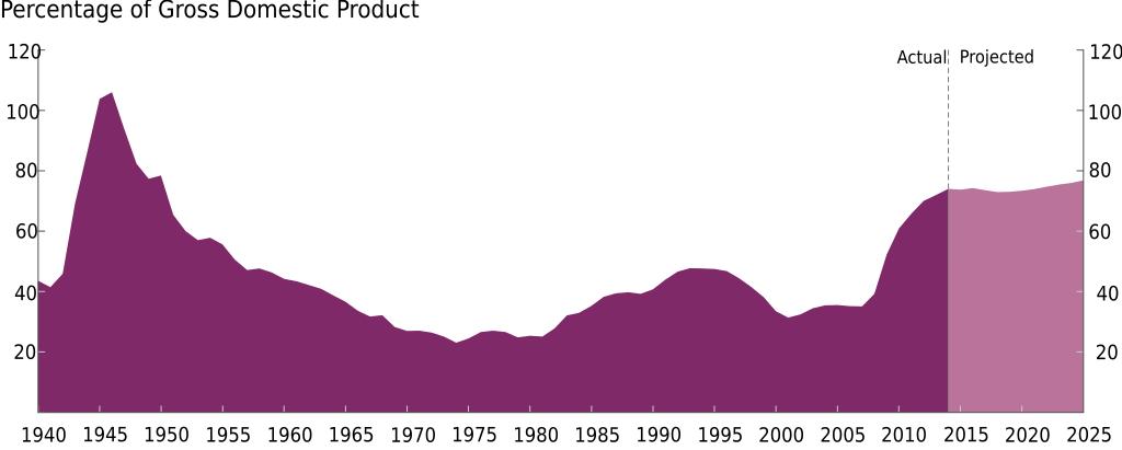 Keywords: FederalDebt1940to2015.svg en Federal Debt Held by the Public as a percentage of gross domestic product from 1940 to 2015 projected until 2025 2015-12-16 https //www cbo gov/sites/default/files/114th-congress-2015-2016/reports/50724-Update-OneColumn_1 pdf An Update to the Budget and Economic Outlook 2015 to 2025 p 71 Congressional Budget Office PD-USGov Debt-to-GDP ratio of the United States Debt in the United States Government debt-to-GDP ratio of the United States United States in the 20th century United States in the 21st century |