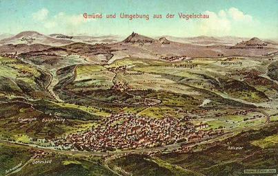 Keywords: Felle Gmünd und Umgebung.jpg Ansichtskarte von Eugen Felle; Technoseum Landesmuseum für Technik und Arbeit Mannheim <br />Motiv Gmünd und Umgebung http //www technoseum de/ early 20th century Creator Eugen Felle PD-old-auto 1934 Eugen Felle Bird's-eye view postcards Historic views of Schwäbisch Gmünd |