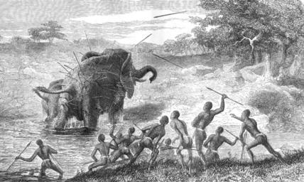 Keywords: Female Elephant Pursued with Javelins.jpg en Female Elephant Pursued with Javelins Protecting Her Young She often stood after she had crossed a rivulet and faced the men though she received fresh spears It was by this process of spearing and loss of blood that she was killed for at last making a short charge she staggered round and sank down dead in a kneeling posture I did not see the whole hunt having been tempted away by both sun and moon appearing unclouded I turned away from the spectacle of the destruction of noble animals which might be made so useful in Africa with a feeling of sickness and it was not relieved by the recollection that the ivory was mine though that was the case I regretted to see them killed and more especially the young one the meat not being at all necessary at that time; but it is right to add that I did not feel sick when my own blood was up the day before We ought perhaps to judge these deeds more leniently in which we ourselves have no temptation to engage Had I not been previously guilty of doing the very same thing I might have prided myself on superior humanity when I experienced the nausea in viewing my men kill these two pp 562-563 1857 http //libweb5 princeton edu/visual_materials/maps/websites/africa/livingstone/livingstone-images html David Livingstone Missionary Travels and Researches in South Africa Including a Sketch of Sixteen Years ™ Residence in the Interior of Africa and a Journey from the Cape of Good Hope to Loanda on the West Coast Thence Across the Continent Down the River Zambesi to the Eastern Ocean London John Murray 1857 David Livingstone other versions PD-Art Uploaded with UploadWizard Elephants being killed Javelins |
