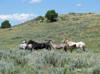 Keywords: feral horses wild walking panorama landscape range herd wildlife animals